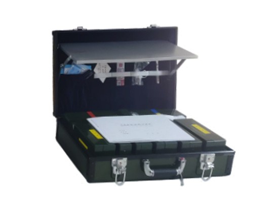 箱體為鋁合金材質,手提箱式。箱內分檢水、檢毒和軍用毒劑三部分,分別用塑料盒包裝。全箱總體積為48.5cm×34cmXl4cm,重約9kg。